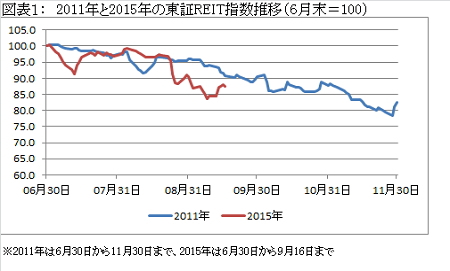 東証REIT指数は2011年6月の1,000ポイント台から8月上旬と10月上旬に急落し、11月末には800ポイントになりました。