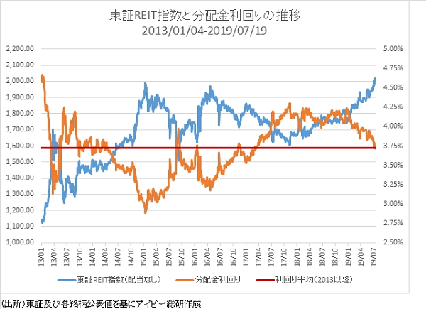 また価格上昇に伴い分配金利回りは低下しているが、図表1の通り2013年以降の全期間における利回り平均値程度までしか低下していない。