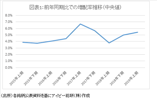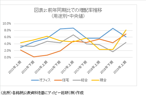 更に分配金が安定的に成長している点も、投資家がJ-REIT市場に留まっている理由と考えられる。図表1は2019年上期時点に上場している銘柄(※1)の増配率を示したものだが、市場全体では4%から6%程度は前年同期比で増配となっている。
