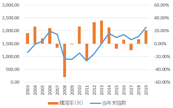 【図表1】年末時点の東証REIT指数推移と年別騰落率(※前年末指数値に対する騰落率)