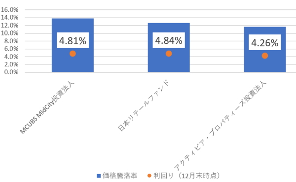 3銘柄ともに10%以上価格が上昇しても、比較的高い利回りとなっていることが分かる。東証REIT指数ベースで見れば、12月末時点の利回りは4.0%であり、高い利回りの銘柄への投資が拡大したことが、J-REIT価格の反発に繋がったと言えるであろう。