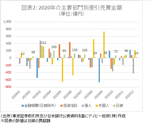 2020年は主要な投資部門で見れば、日銀だけが2019年比で買越額が増加した投資主体となった(図表1参照)。日銀以外の投資主体では、個人投資家の売越額が、主要な投資部門の中で最大となっているが、前年比では改善している。