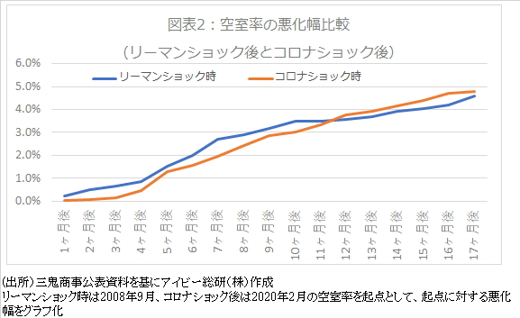 コロナ禍前の2020年2月は2%を割り込んでいたが、コロナ禍によって急速に悪化し、2014年7月以来の水準まで空室率は拡大している。空室率の悪化幅はリーマンショック後と同じ急速なもの(図表2)になっている。リーマンショック後は、2009年3月に空室率が6%を超えてから1年後の2010年3月には8.75%まで悪化していることから、今後も悪化傾向は続きそうだ。
