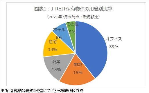 今回は、図表1の通り、J-REITが保有する物件で用途別の取得額では40%程度と1位になっているオフィスビルについて記載する。