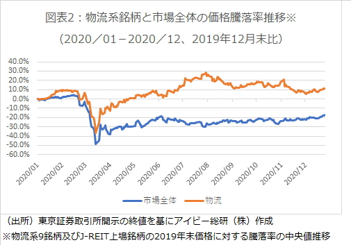 コロナ禍の影響を受けない用途として物流系銘柄の価格は、2020年3月のコロナショックによる急落からいち早く立ち直った。2020年の値動きを示した図表2の通り、7月にはコロナ禍前の2019年末と比較して30%近い上昇を示した。