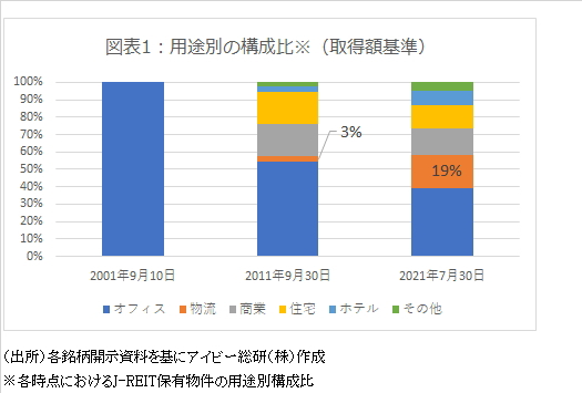 物流施設は、J-REITが2021年7月末時点で保有する20兆9,147億円の不動産のうち3兆9,476億円を占め、保有比率では19%とオフィスに次ぎ第2位となっている。J-REIT市場がスタートしてから10年後の2011年9月末時点では3%(取得額で2,223億円)だったことと比較すると、この10年間で急速にJ-REIT市場での存在感を増した用途になっている。