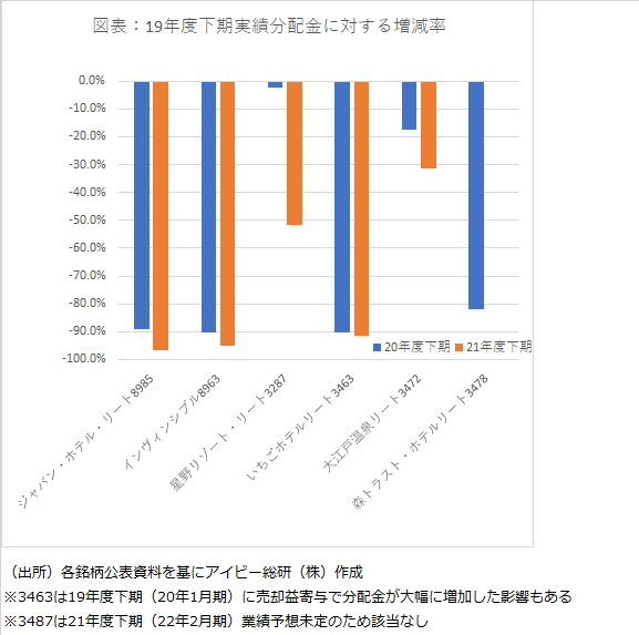 その他のホテル系銘柄も変動賃料減少の影響は大きく、図表の通り分配金が急減する事態になっている。