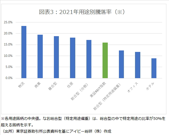 2021年の価格動向を用途別にみると、図表3の通り東証REIT指数をアウトパフォームする用途が多かった。これは東証REIT指数への寄与が大きいオフィス系の価格上昇率が東証REIT指数を下回っているためだ。