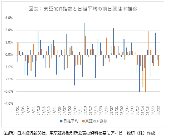 2022年4月以降のJ-REIT価格は、乱高下する株式市場と比較すれば穏やかな値動きが続いていた。図表は4月から6月22日までの東証REIT指数と日経平均の前日比騰落率を示しているが、5月末までは同様の値動きを示した時は株式市場の変動幅が大きくなっていた。