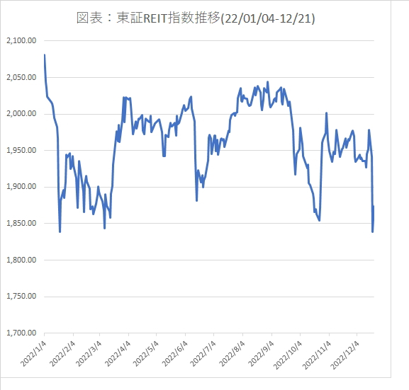 まだ2022年の取引は続くが、J-REIT価格は金融政策に左右された1年となった。急落は図表の通り、12月で4回目であり、1月、6月、10月は米国FRB(連邦準備制度理事会)の利上げで、12月は日銀の事実上の利上げに拠るものと言えるだろう。東証REIT指数で見れば、2,000ポイント近い水準から短期で1,850ポイント程度まで下落した。