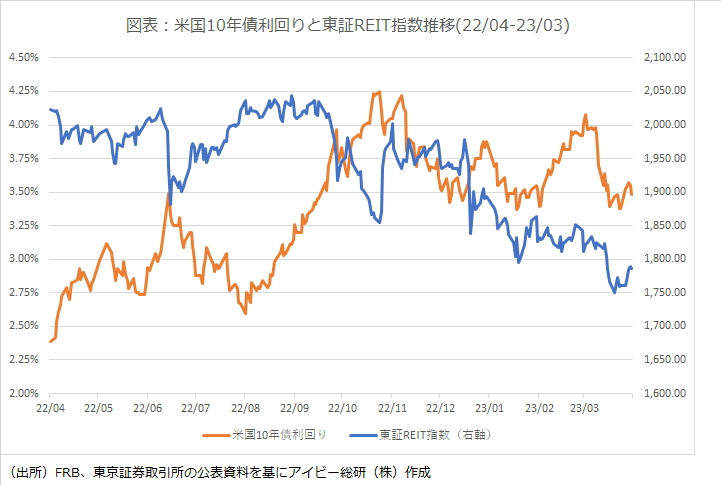 前述の通り、3月は外国人投資家が5ヶ月振りにJ-REITを買い越した。その要因として、米国10年債利回りが3.5%で推移する傾向が強まったことが影響していると考えられる。