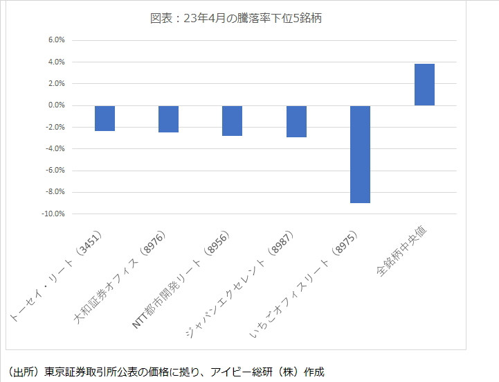 4月は9銘柄の価格が下落したが、オフィス系またはオフィスを主体とする銘柄が大半を占め(図表)ている。また時価総額が最も大きい日本ビルファンド投資法人(8951)の価格上昇率も3.4%と個別銘柄の騰落率中央値3.9%に到達していない。