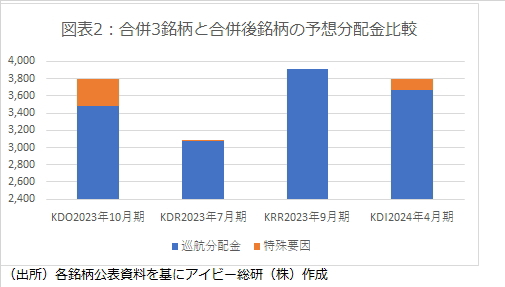 KRIの合併後、最初の決算期(24年4月期)予想分配金は1口当たり3,800円とし、目標を4,000円としている。3銘柄の前期実績ベースで比較すると、巡航分配金(※1)は、合併説明会資料(※2)に拠るとKDOやKRRと同水準となり、KDRに対しては大幅な増配となる。なお当期予想に対しては、KRRの予想分配金が全額巡航分配金となるため、図表2の通りKRRの投資家から見ればKDIの予想分配金は減配となりそうだ。