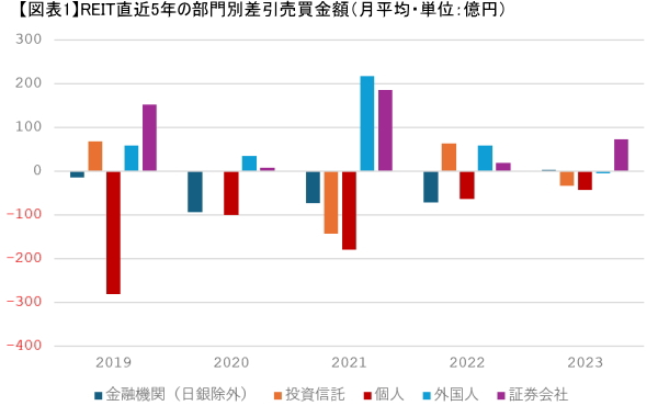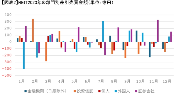2021年には外国人、2022年は外国人と投資信託が買い越しとなり、J-REIT価格の上昇を支えていた点と比較すると、2023年はコロナ禍の影響を受けた2020年よりも買い手不足の1年となった。