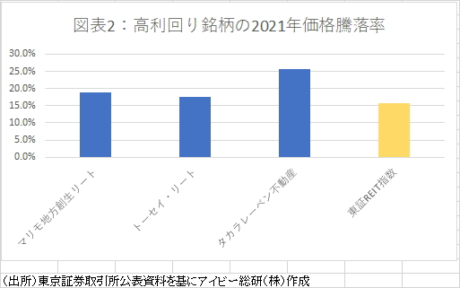 また利回りが高いということは投資家の懸念が強い銘柄ということになるが、価格が上昇しないということではない。2021年の東証REIT指数が15%と大幅に上昇した年となったが、図表2の通り前述の3銘柄の価格上昇率も東証REIT指数を超えている。