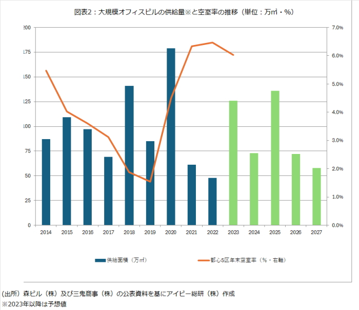 1点目は、大量供給される大規模ビルの立地や建物グレードが高く、大規模ビルを保有するJ-REITの銘柄にとっては、テナントが新築ビルに移転する可能性が高くなる点だ。