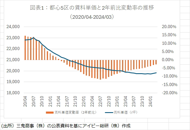 コロナ禍によって悪化したオフィス賃貸市場は2023年以降徐々に回復に向かっており、2022年夏に6.5%に迫っていた東京都心5区(千代田・中央・港・新宿・渋谷)の空室率は2024年3月に5.5%を切っている。更に賃料単価も2024年2月から漸く反発しており、図表1の通り2年前比の賃料反動率も2024年3月に3%以下の下落に留まっている。