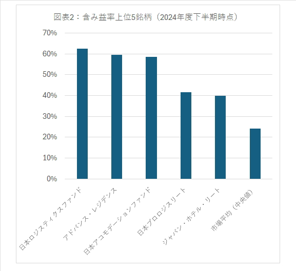 売却する不動産と比較して取得する不動産の利回りが低くなるため、ポートフォリオ全体の利回りが低下するためだ。ただし、J-REIT全体でのポートフォリオ含み益率は20%を超え、図表2の通り3銘柄が50%を超えている。