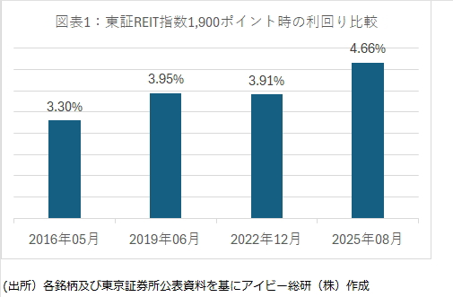 J-REIT市場では、増配基調が続いている。前回連載で記載した通り、同じ東証REIT指数1,900ポイント程度でも図表1の通り、2025年8月時点での利回りは4.6%と高い状態になっている。