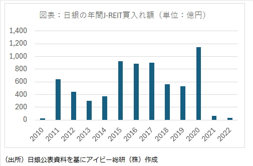 これは、日銀がJ-REITの買入れを実施した時期のJ-REIT価格が高値圏であったことが影響している。日銀が最後にJ-REITを買入れした時期は2022年6月(12億円)だったが、年間ベースで見ると、図表の通りコロナショックの影響を受けた2020年の額が大きくなっている。