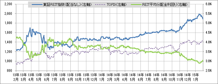 <東証REIT指数と予想分配金利回りの推移> (グラフは2013年2月~2015年1月の24ヶ月間)