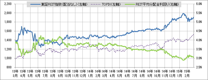 <東証REIT指数と予想分配金利回りの推移> (グラフは2013年3月~2015年2月の24ヶ月間)