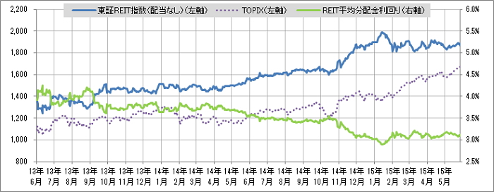 <東証REIT指数と予想分配金利回りの推移> (グラフは2013年6月~2015年5月の24ヶ月間)