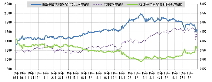 8月の東証REIT指数(配当なし)は、前月比-7.48%の下落。一ヶ月を通してTOPIXと同じような推移を示した。月前半は1,750ポイントを維持していたが、中国が11日から3日連続して人民元の基準相場を切り下げると、中国景気減速による影響を懸念して世界的にリスク回避の動きとなった。東証REIT指数も19日から6営業日で-166.59ポイントの大幅下落。直近の安値である7月10日の1,645.28を下回り、26日は1,590.56と2014年7月以来一年一ヶ月ぶりの安値を付けた。その後中国が追加金融緩和を発表すると急反発したが、月末は1,634.37と月間ベースで見ると4ヶ月連続の下落となった。世界的なリスク回避を煽りを受け、底値の見えない状態となっている。一方、投資口価格の下落に伴い、平均分配金利回りは一時3.74%と、2014年4月以来の水準まで上昇した。