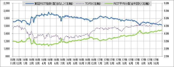 これに伴いREIT全体の分配金利回りは4.24%と2013年6月以来4年4ヶ月ぶりの高水準となっている。分配金利回りから見れば十分に割安な価格帯となっており、投資信託の資金流出が収縮すれば、過度なリスクが後退し、底入れも期待できよう。