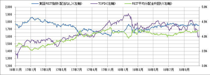 <東証REIT指数と予想分配金利回りの推移> (グラフは2016年11月~2018年10月の24ヶ月間)