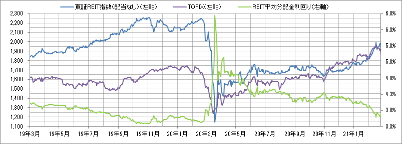 <東証REIT指数と予想分配金利回りの推移> (グラフは2019年3月~2021年2月の24ヶ月間)