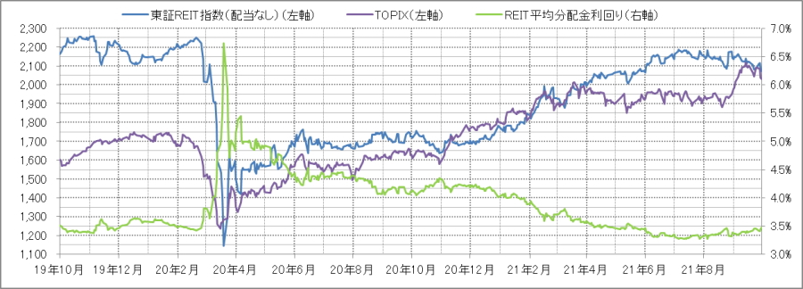 <東証REIT指数と予想分配金利回りの推移> (グラフは2019年10月~2021年9月の24ヶ月間)