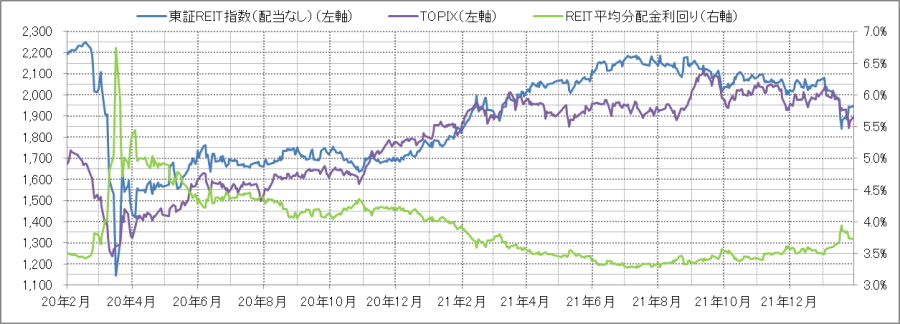 <東証REIT指数と予想分配金利回りの推移> (グラフは2020年2月~2022年1月の24ヶ月間)