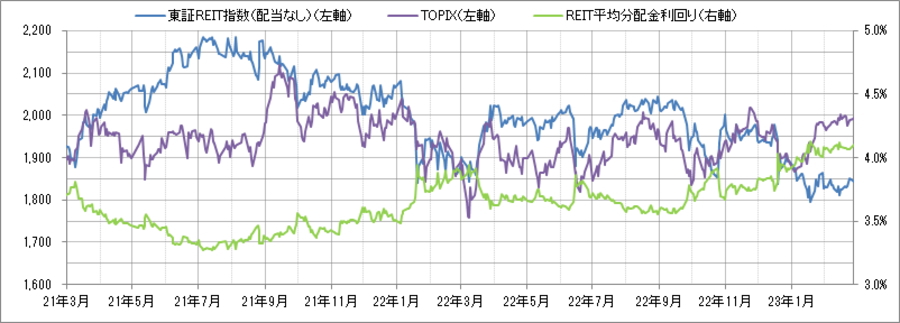<東証REIT指数と予想分配金利回りの推移> (グラフは2021年3月~2023年2月の24ヶ月間)