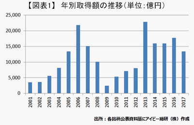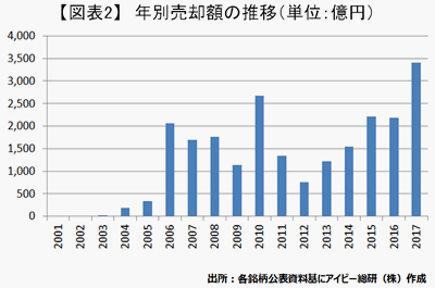 まずJ-REITの物件取得動向ですが、日銀の異次元金融緩和が始まった2013年以降でみれば、図表1の通り2017年は初めて年間の取得額が1兆5,000億円を割り込む結果となりました。