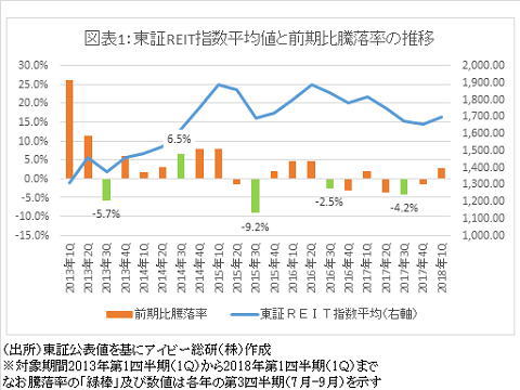 図表1は、日銀の異次元緩和が始まった2013年以降における四半期ごとの東証REIT指数の平均値を前四半期と比較したものだ。