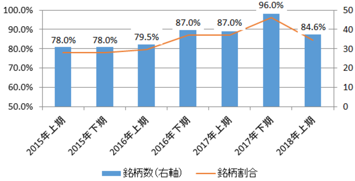 J-REITの2018年上期(1月~6月)の分配金は、図表1の通り、前年同期比で比較すると85%近い銘柄が増配となった。2017年下期と比較すると増配銘柄の割合は減少しているが、2016年下期から2年連続で80%以上の銘柄で増配となっている。