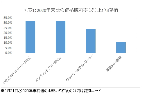 図表1は、2021年2月24日と2020年末終値を比較した価格騰落率上位3銘柄を示している。3銘柄ともにホテル系銘柄であり、2021年2月24日時点の利回りは、いちごホテルリートが1.93%、インヴィンシブルが0.6%、ジャパン・ホテル・リートが0.59%と極めて低い水準になっている。
