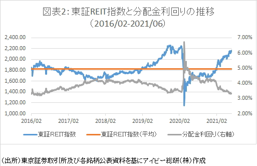 このように、図表1は市場環境や政策などが大きく異なる市場開設初期の時期も含んでいるため、これからJ-REIT投資を始めるという点では参考にならない点も多い。この点から日銀がマイナス金利政策を打ち出した2016年2月以降の東証REIT指数と分配金利回りを示した図表2が参考になると考えられる。