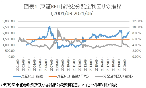 図表1は、J-REIT市場がスタートした2001年9月から2021年6月までの予想分配金利回りとJ-REITの代表的な指数である東証REIT指数の推移を示したものになっている。東証REIT指数は、TOPIXと同様に時価総額ベースで算出されている。従って時価総額が大きい銘柄の影響を受けやすい指数だ。